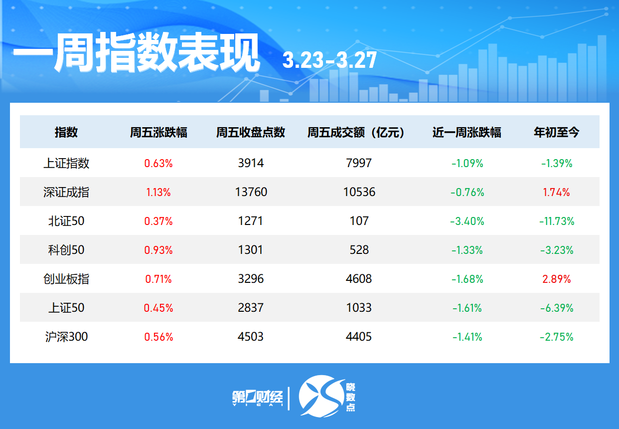 本周(3月23日至27日)A股指数集体下跌,沪指本周累计跌1.09%,深成指跌0.76%,创业板指跌1.68%,科创综指跌0.43%。