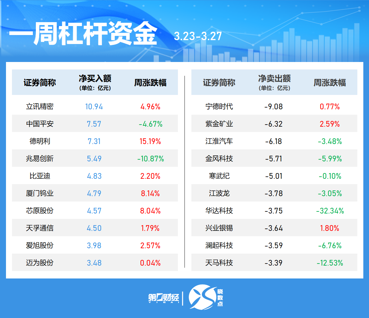 立讯精密本周获融资净买入居首,净买入额为10.94亿元,周涨4.96%。中国平安、德明利、兆易创新获净买入额居前;宁德时代、紫金矿业、江淮汽车遭净卖出额居前,金额分别为9.08亿元、6.32亿元、6.18亿元。
