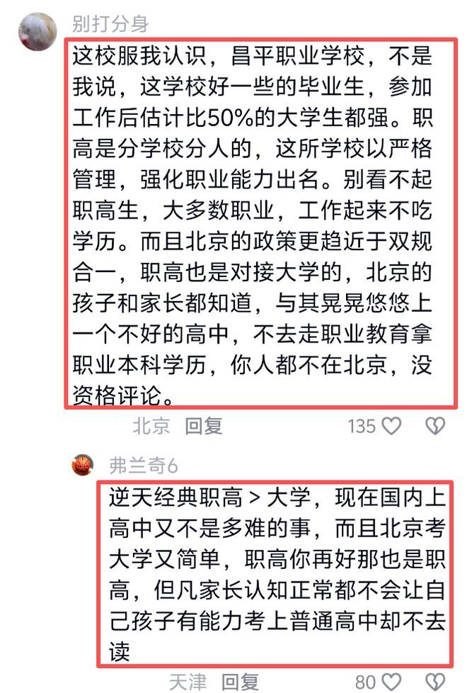 可评论区网友们却无人赞赏,没人觉得这名北京的职高女生有什么含金量,有网友直截了当地吐槽:还真把自己当盘菜了,北京的职高女也不过是职高女,甚至有人形容考上北京职高的难度,不亚于早上起来喝一杯水。