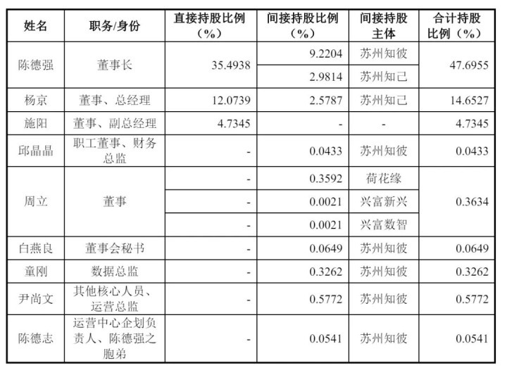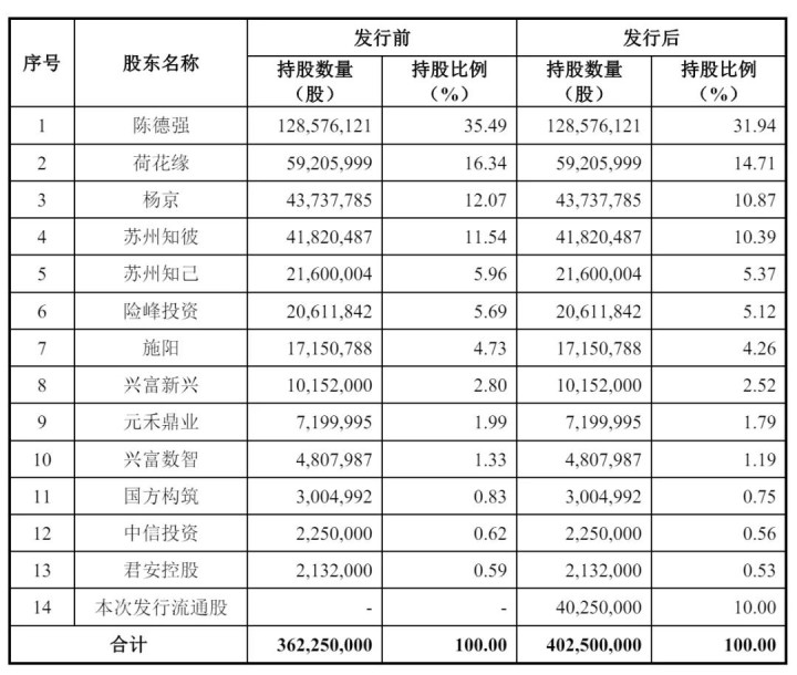 IPO后,陈德强直接持股为31.94%,荷花缘持股为14.71%,杨京持股为10.87%,苏州知彼持股为10.39%,苏州知己持股为5.37%,险峰投资持股为5.12%,施阳持股为4.26%,兴富新兴持股为2.52%;