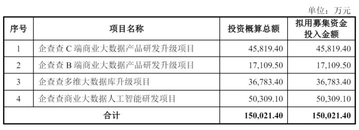 企查查计划募资15亿元,其中,4.58亿元用于企查查C端商业大数据产品研发升级项目,1.71亿元用于B端商业大数据产品研发升级项目,3.68亿元用于多维大数据库升级项目,5亿元用于商业大数据人工智能研发项目。