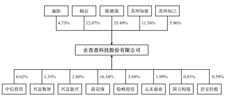 IPO前,企查查控股股东、实际控制人陈德强直接持股为35.49%,通过苏州知彼间接控制11.54%股权,通过苏州知己间接持股为5.96%,合计控制公司53%股权。